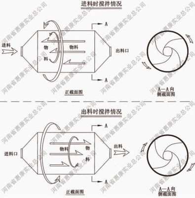 攪拌時(shí),物料隨筒體沿逆時(shí)針?lè)较蛐D(zhuǎn)的同時(shí),在慣性作用下向左推移,從而達(dá)到混合目的。