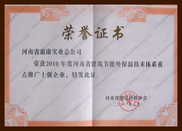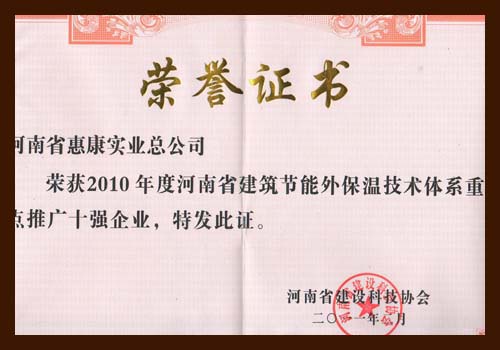 河南省惠康實(shí)業(yè)總公司榮獲2010年度河南省建筑節(jié)能外保溫技術(shù)體系重點(diǎn)推廣十強(qiáng)企業(yè)。